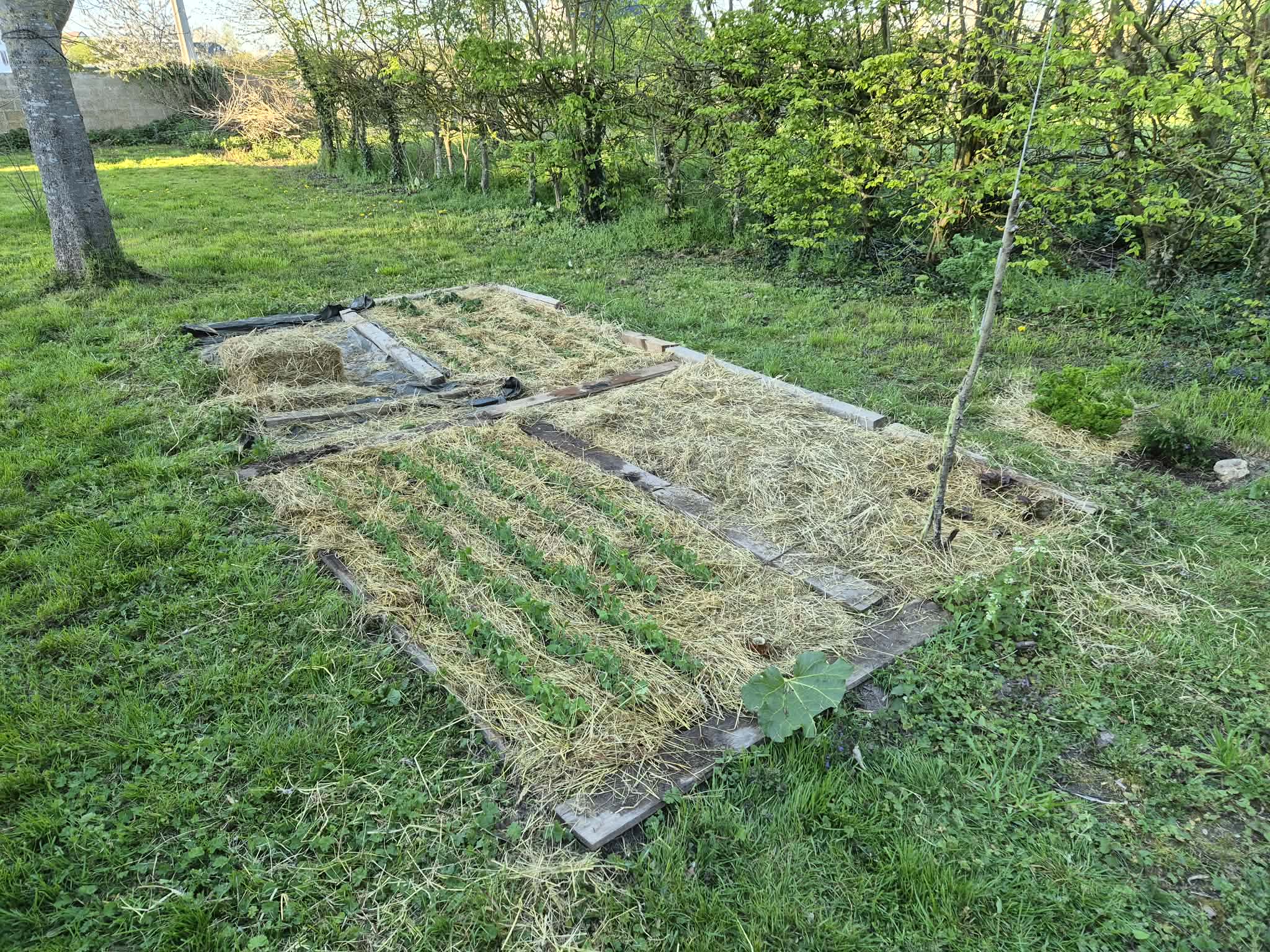 J’en ai profité pour mettre du foin sur d’autres cultures, notamment les petits pois et les épinards. Habituellement, je passe un temps fou à désherber. Ou alors, je ne le fais pas, mais alors mes cultures sont en concurrence avec les mauvaises herbes.