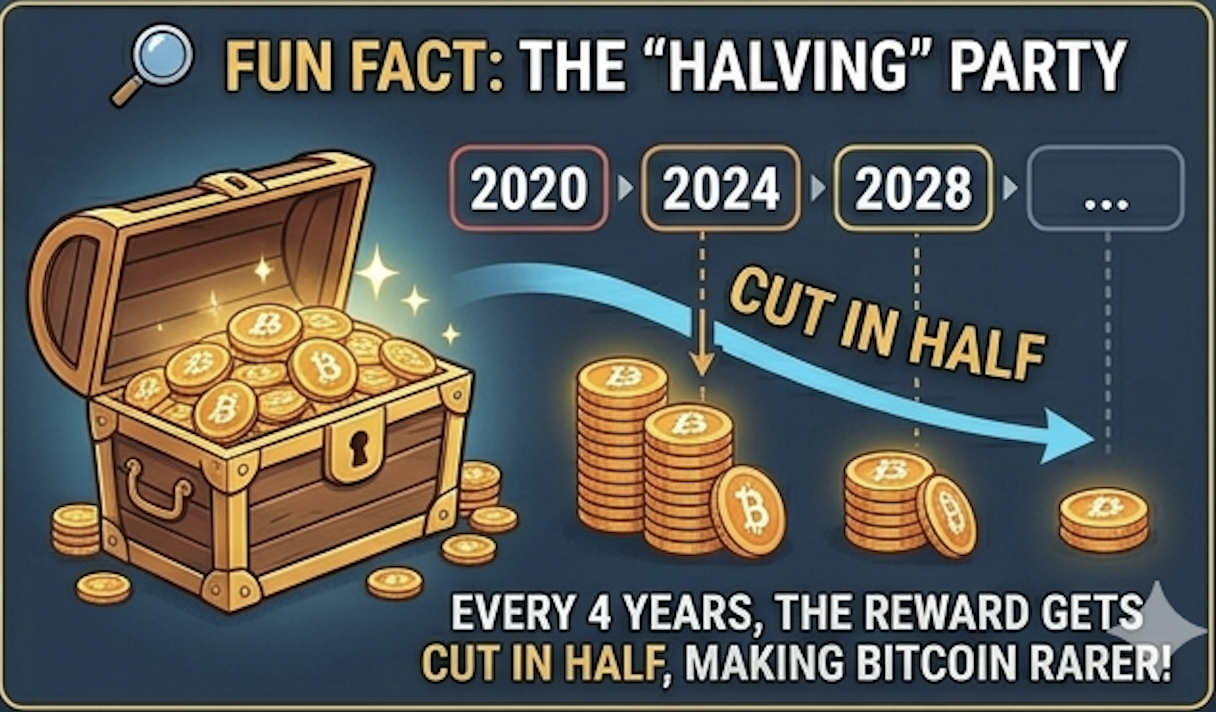 Every four years, the reward for mining gets cut in half. It’s like the treasure chest getting a little smaller over time. This makes Bitcoin even rarer as the years go by!