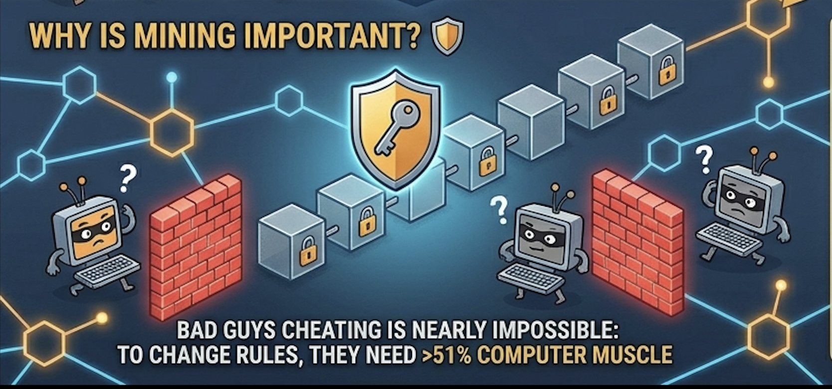 Mining isn't just for fun. It’s what keeps Bitcoin safe! Because it takes so much "computer muscle" to solve the puzzles, it makes it nearly impossible for a bad guy to cheat. To change the rules, they would need more computer power than almost everyone else in the world combined!